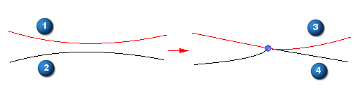 该命令剪切所选的电线,并自动创建新电线。例如,如果您选择电线 1 和线 2,拼接自动创建电线 3 和 4。