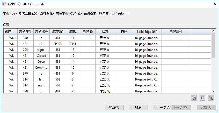 在单击线束向导 - 第 2 步,共 3 步对话框上的下一步后,线束向导 - 第 3 步,共 3 步对话框将显示连接定义。