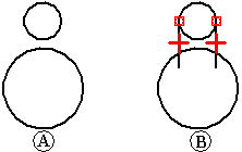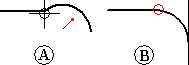 如果线条与弧不相切 (A),应用相切关系会修改其中一个元素或两个元素以使它们相切 (B)。