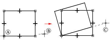旋转命令沿着轴转动或转动复制 2D 元素。此命令需要指定旋转的中心点 (A),旋转的起点 (B),和旋转的终点 (C)。