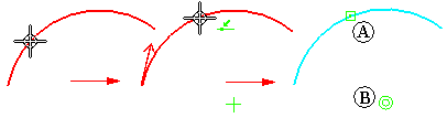 拆分命令可以在指定位置处对开放或封闭元素进行拆分。在拆分元素时,系统会自动应用合适的几何关系。例如,在拆分圆弧时,在拆分点处应用连接关系(A),而在圆弧的中心点处应用同心关系(B)。