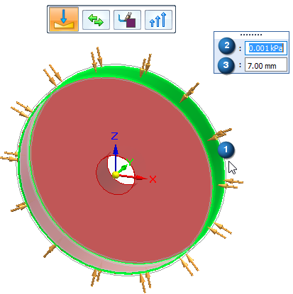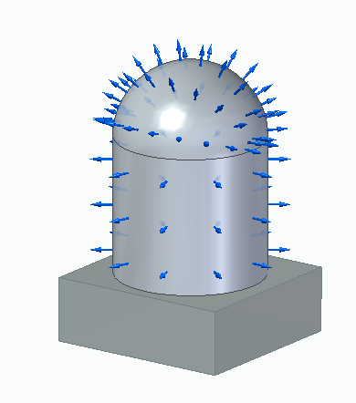 载荷符号添加到设计空间中的选定几何体,设计体上显示编辑定义手柄以及标签(如压力 1)。可以使用此手柄编辑创建载荷的输入。