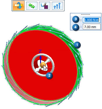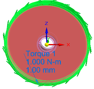 载荷符号添加到设计空间中的选定几何体,设计体上显示编辑定义手柄以及标签(如扭矩 1)。可以使用此手柄编辑创建载荷的输入。