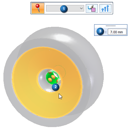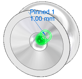 销钉约束符号会添加到设计空间中的选定几何体,并在设计空间体上显示编辑定义手柄,手柄具有标签,如销钉 1,并具有指派的值。可以使用此手柄来编辑用于创建该约束的输入。