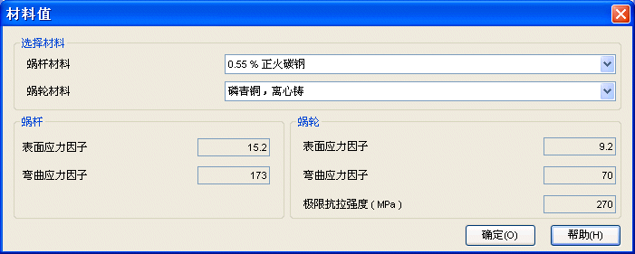设计参数选项卡中的材料按钮可用于选择蜗杆和蜗轮的材料。