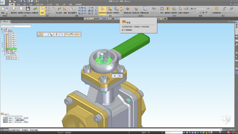 3 使用”传递”功能,将顶层装配下的09部件,传递至“手柄”子装配层级下,实现部件与子装配间的层级调整