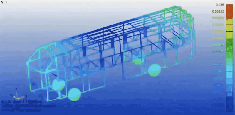 通过对结构满载强度、振动、疲劳分析,验证承载式车辆骨架结构的承载能力,减少了结构冗余设计,优化整车重量分布。