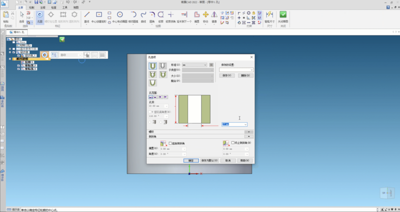 4 使用“孔”命令,在坐标系2的XY平面上,定位孔的轮廓,并向外打穿