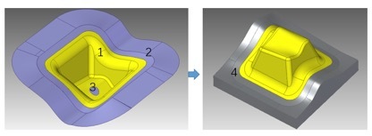 塑料模具的分型设计过程中,关键步骤通常分为动/定模区域1的划分,型面开孔3的修补,分型面2的创建,动定模型芯4的分割等几个阶段,如下图所示。