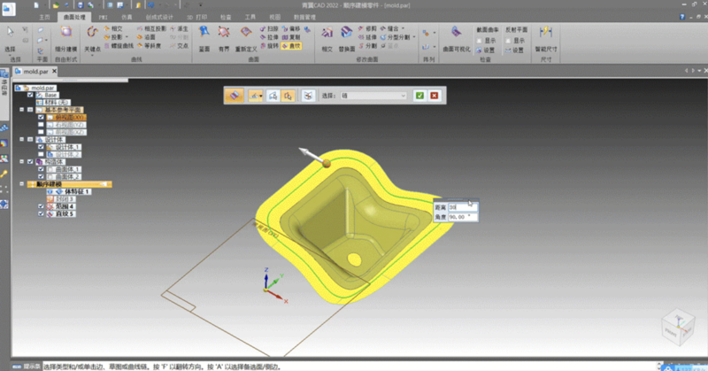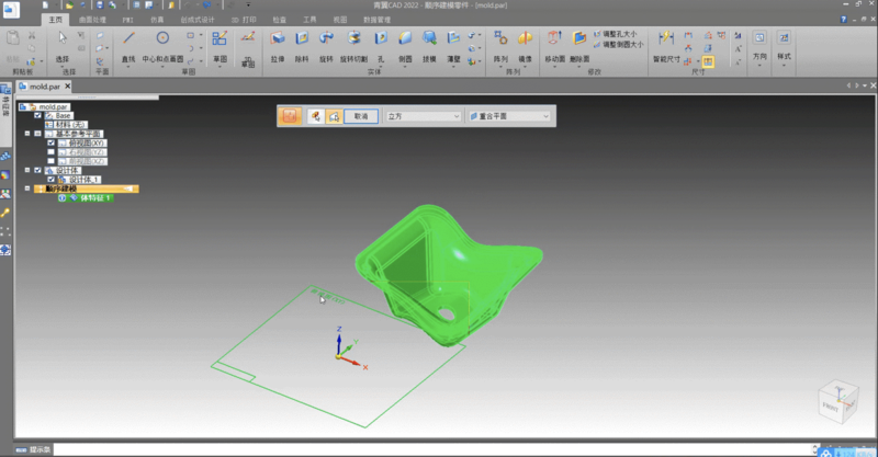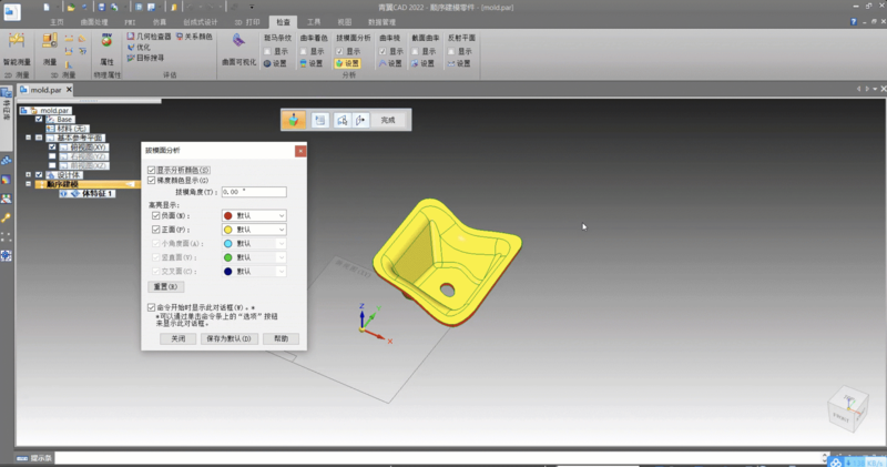 1 青翼CAD拔模面分析工具能够参考分模方向快速区分正面和负面,并着色成不同颜色表示型芯和型腔面