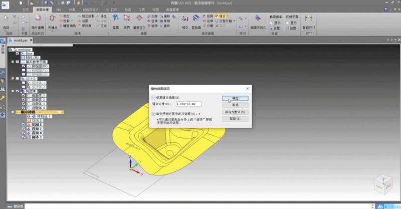 用曲面处理中的复制命令把黄色的型腔区域面提取,再使用缝合命令把分型面,补片面和复制面缝合一体。