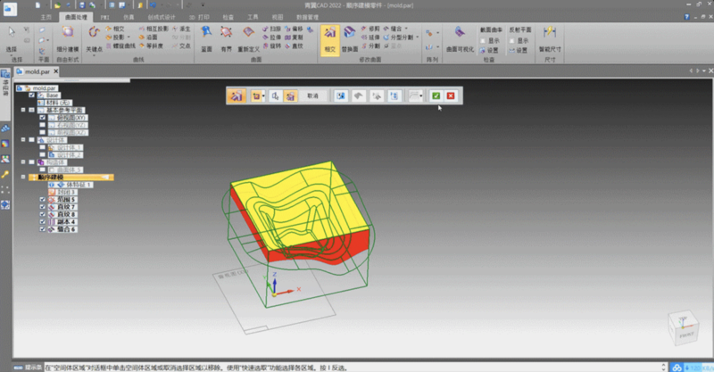 青翼CAD曲面处理中的相交命令是比较好的分割工具,选择创建设计体方式能够快速分割实体,并允许灵活取舍需要部分。