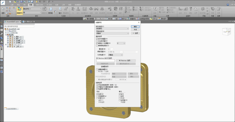 1 首先打开一个装配模型,进入到仿真分析环境,同时新建一个静态分析研究类型,并给每个零件指派材料