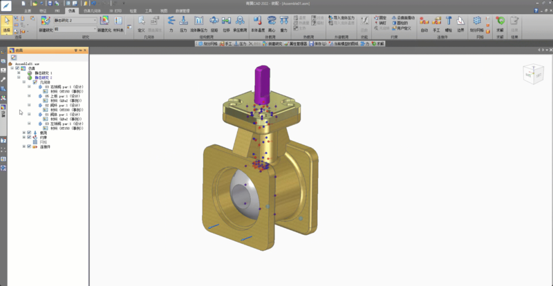 在青翼CAD中,仿真分析不仅支持产品级分析,也支持装配级分析。仿真环境提供了从模型检查,模型简化,设定材料,添加载荷,添加约束,网格划分,自动求解以及结果查看完整的解决方案。对于装配级的仿真,在装配连接方式中,系统支持手动、自动的连接方式:包括粘贴、线性连接;搜索距离,两个没有连接到一起的零件最远距离,网格将其连接;螺栓连接,创建两个孔之间的刚性连接;边的连接等。