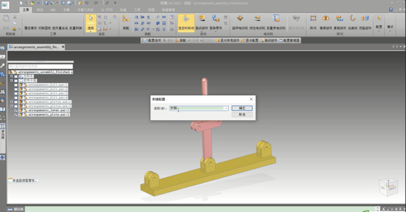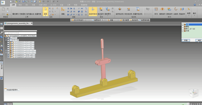 在主页菜单的配置命令栏中,选择你需要的配置名称,即可将装配的显示状态切换到指定状态,在选择配置显示中,青翼CAD支持复选方式,同时选中 多个配置名称,则将各个配置中显示的零件作合并显示。