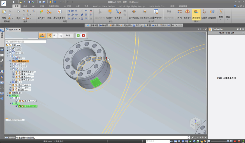 对此青翼CAD提供了名为“复制部件”的命令,能通过目标零件或目标坐标系定向装配部件,所以即使是对阵列生成的零件进行操作也可以保持配合关系。通过将“克隆”和“复制部件”的结合使用既可以快速完成重复装配,又可以保持配合关系。