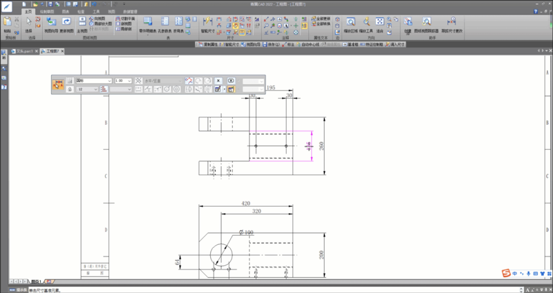 可以看到,这张工程图中除了常规的尺寸标注,还有公差带、孔标注、基准、形位公差、表面粗糙度、等等;本次实例主要介绍如何使用工程图中的命令快速标注。