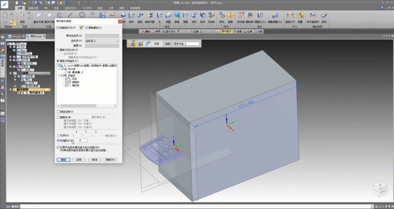 1 注塑模设计,常常会设置模具的缩水率,在青翼CAD中,我们使用“缩放体”命令,来调整模型的放大和缩小,也可以在添加“零件副本”时,设置收缩率