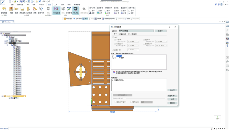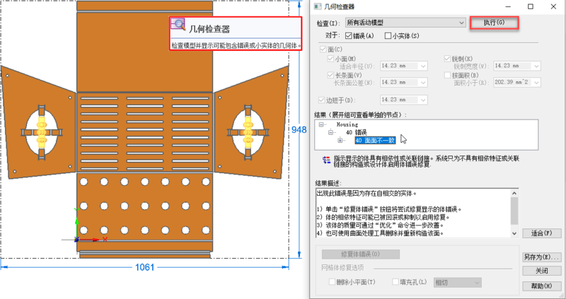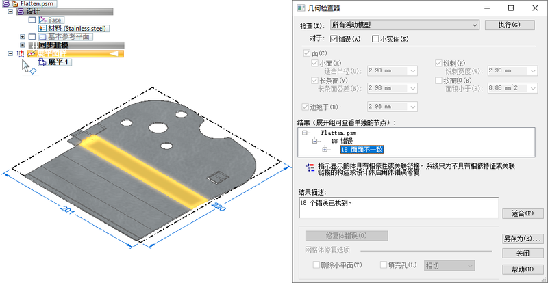 单击【检查】 → 【几何检查器】命令,可以获取重叠部分的位置信息;经分析得出弯边长度需要调整。