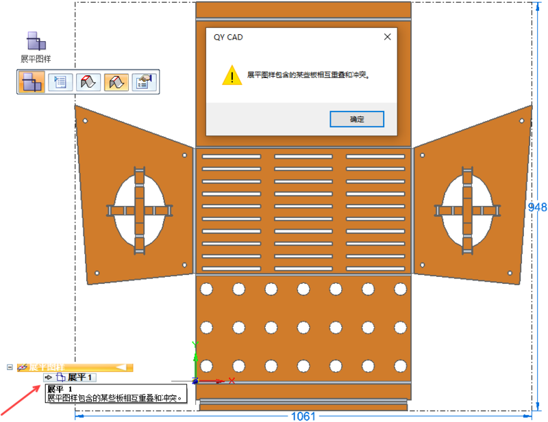 钣金模型展平时,系统会自动进行干涉检查,如果有重叠部分则会给出提示信息。