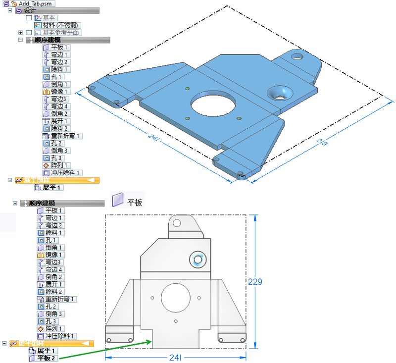 3. 考虑工装夹具的设计需求,为展平模型追加平板特征。