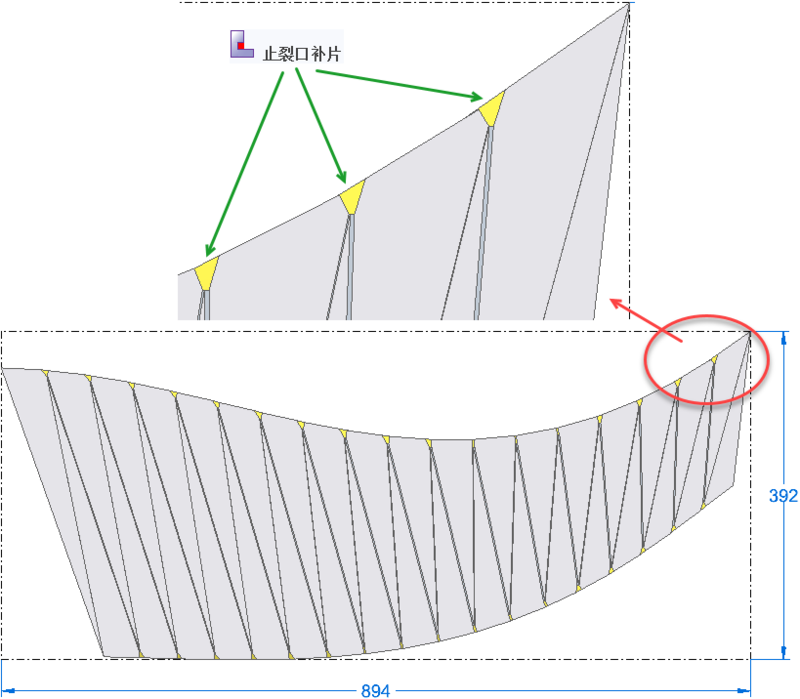 4. 止裂口补片:根据加工需要,为展平模型填补缺口。